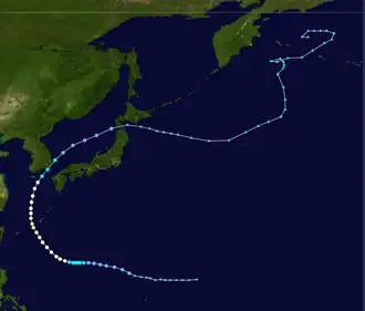 An area of convection on a surface trough which extended until Midway Atoll was first monitored by the China Meteorological Agency on June 25, approximately 400 km to the north of Enewetak Atoll.[1][2] The Japan Meteorological Agency (JMA) also started to monitor the system at this time, analysing it with a pressure of 1006 mBar in their first bulletin. The disturbance moved to the west without further development, based on satellite imagery.[1] On June 29, the system became better defined on satellite coverages, with the Joint Typhoon Warning Center (JTWC) issuing their first bulletin on the system at 00:00 UTC that day.[3] Based on a ship that reported gale-force winds near its center, the JTWC upgraded the system to a tropical storm at this time, with the agency naming it Gilda.[3] The JMA, at that time, analysed the barometric pressure of the system to be 990 mBar.[2] Gilda then began to curve northwards, as a mid-atmospheric trough began to be dominant over East China.[3] At 06:00 UTC of July 2, the system intensified to a typhoon, with its barometric pressure analyzed by the JMA to be 965 mBar.[2][3] Early the next day, a Japanese vessel named Shinkyoyu Maru passed near the typhoon, recording a pressure of 988 mBar and winds of over 45 knots.[3] Gilda slowly intensified despite a favorable environment and while passing through the Ryukyu Islands, it strengthened to a Category 2 typhoon on July 4 and reached its peak intensity shortly, with one-minute sustained winds of 165 km/h (105 mph) and a barometric pressure of 945 mBar, equivalent to a mid-level typhoon.[2][3] On the same day, a reconnaissance aircraft passed through its eye, measuring a minimum pressure of 944 mBar.[3] Shortly after peaking, the typhoon slowly weakened to a Category 1 due to increasing wind shear and unfavorable sea surface temperatures on the next day.[3] A mid-atmospheric subtropical ridge curved the system to the north-northeast and while nearing South Korea, Gilda weakened to a tropical storm and accelerated, due to an upper-level southwesterly flow over Manchuria.[3][2] As it entered the Sea of Japan, the disorganized Gilda started to become extratropical while weakening to a tropical depression on July 7.[3][2] In post-tropical analysis, Gilda remained a tropical depression as it made landfall through Hokkaido on the next day before becoming fully extratropical as it moved offshore in the Pacific Ocean on July 9.[2][3][4] The extratropical remnants of Gilda briefly strengthened while nearing the Kuril Islands and it started to undergo a loop before entering the Sea of Okhotsk.[2] There, it weakened below gale-force and dissipated on July 17, ending its long journey.[2]
