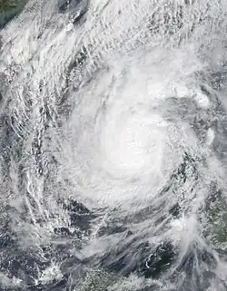 Typhoon Kammuri, known in the Philippines as Typhoon Tisoy, was a powerful typhoon which impacted the Philippines in early December 2019. Kammuri, which means crown or Corona Borealis in Japanese, the twenty-eighth named storm and sixteenth typhoon of the 2019 Pacific typhoon season, Kammuri developed from a tropical wave situated a couple hundred kilometers south of the Mariana Islands. From November 25 to 27, the system tracked westward at a steady pace and rate of intensification, first making minor impacts in Guam. On November 28, the system intensified into a typhoon as environmental conditions became marginally conducive for significant development. From November 29 to December 1, Kammuri was unable to strengthen to previous estimates due to its near stationary movement as a result of weak steering currents, upwelling itself consequently. On December 2, the system tracked westward at a much faster speed of 19 km/h (12 mph) and rapidly intensified over warm Philippine Sea waters, before making landfall in the Bicol Region of the Philippines at peak intensity as a category 4-equivalent typhoon.