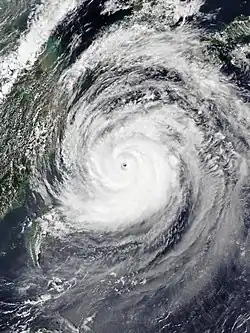 On August 30, Maysak's structure became indicative of an impending phase of rapid intensification according to the JTWC.[17] The typhoon developed a central dense overcast that day with an eye embedded within.[18] An approaching trough over eastern China and western Japan caused Maysak to accelerate towards the north as it continued to traverse energetic ocean waters.[19] The typhoon's eye became symmetric and spanned 55 km (34 mi) across.[20] By 21:00 UTC, the eye had contracted to a diameter of 19 km (12 mi). Around that time, the JTWC assessed the typhoon as having one-minute sustained winds of 215 km/h (134 mph).[21] At 00:00 UTC on September 1, the JMA determined that Maysak had ten-minute maximum sustained winds of 110 mph (180 km/h) with gusts of up to 250 km/h (160 mph). The associated barometric pressure was estimated at 935 hPa (mbar; 27.61 inHg).[22][23] Maysak held this intensity as it began to move into a less conducive environment for storm development within the East China Sea.[24] Soon, Maysak began to weaken steadily as it passed the East China Sea, slowing back down to a Category 3 storm. The storm then made landfall near Busan, South Korea at 02:20 KST on September 3 (17:20 UTC on September 2), with 10-minute maximum sustained winds at 155 km/h (96 mph) and the central pressure at 950 hPa[25] equivalent into a Category 2 typhoon. After that, it crossed the Sea of Japan and hitting North Korea into Jilin in northeast China. Soon after, Typhoon Maysak transitioned into an extratropical low in northeast China.[26]