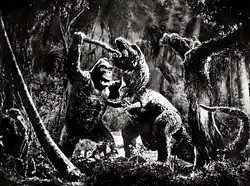 O'Brien was again responsible for special effects in the 1933 monster film King Kong, which featured a climactic battle between the giant ape and a Tyrannosaurus. This scene is credited with the film's success both in terms of cinematic experience and in securing financial backing. In a 2005 tongue in cheek mockumentary, "T. Rex: A Dinosaur in Hollywood," no one less than Kong himself explained why. "Well, I had to find a suitably impressive monster to showoff my great strength and ruthlessness. There was only one real choice!"[19]