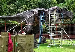 Full size animatronic Tyrannosaurus being assembled in Combe Martin Wildlife and Dinosaur Park, North Devon, United Kingdom.