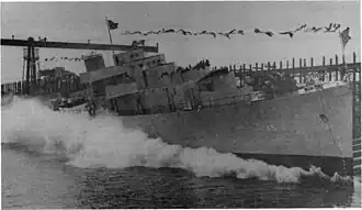 ![]() USS Annapolis (PF-15), being launched sideways on 16 October 1943, due to constrictions of the harbor