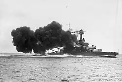 California's keel was laid down on 25 October 1916 at the Mare Island Naval Shipyard in Vallejo, California.[2] Work was halted for a short time during World War I while the shipyard focused on outfitting smaller craft.[4] She was launched 20 November 1919 and commissioned on 10 August 1921.[2] On entering service, she joined the Battle Fleet, serving as its flagship. For the duration of her peacetime career, California was occupied with routine training exercises, including joint Army-Navy maneuvers and the annual fleet problems. On the night of 11 November 1924, Lieutenant Dixie Kiefer took off from the ship, the first night aircraft launch in history. Further experimentation with aircraft continued in early 1925, when the ships of the Battle Fleet received a squadron of Curtiss TS-1 floatplanes on 31 March. In mid-1925, the Battle Fleet crossed the Pacific Ocean on a goodwill cruise to Australia and New Zealand; on the way, the ships stopped in Pago Pago, American Samoa. California underwent a refit at the Puget Sound Navy Yard at Bremerton, Washington later that year.[5]