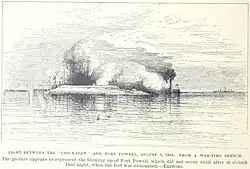 The two Milwaukee-class ships bombarded Fort Morgan for about an hour and a half while the wooden ships passed through the mouth of Mobile Bay. Chickasaw fired 75 rounds at the fort beginning at 07:10; the return fire badly damaged her funnel so that the crew was forced to use tallow and coal tar to generate enough steam to keep the ship in the fight. She engaged the Tennessee two hours later until the ironclad surrendered at 10:40.[10] The Confederate ironclad was shooting at the wooden ships at this time at point-blank range in a chaotic melee with both sides making multiple attempts to ram each other. Chickasaw remained off the Tennessee's stern through their engagement and fired on her at ranges between 10 and 50 yards (9.1 and 45.7 m). None of her 52 shells penetrated their target's armor, but they did jam shut several of the armored shutters that protected the aft gun ports, including the stern gun port at 09:40.[11] Perkins claimed that his ship shot away the Tennessee's flagstaff, smokestack and the exposed steering chains that controlled her rudder. Chickasaw was struck 11 times during the action, with one shot penetrating her deck that set some of the crew's hammocks on fire.[10] Two of Chickasaw's sailors, Chief Boatswain's Mate Andrew Jones and Master-at-Arms James Seanor, were later awarded the Medal of Honor for their actions during the battle.[12][13]