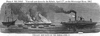 ![]() USS Clifton playing a fire hose on a Confederate fire raft on the lower Mississippi River, 17 April 1862