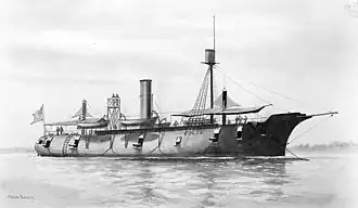 Galena's keel was laid down by Maxson, Fish & Co. in 1861 and she was launched on 14 February 1862.[7] The ship was commissioned on 21 April 1862 with Commander Alfred Taylor in command.[12] Galena arrived in Hampton Roads on 24 April, after having suffered several engine breakdowns en route,[13] and was assigned to Flag Officer L.M. Goldsborough's North Atlantic Blockading Squadron. Commander John Rodgers relieved Taylor the same day.[12] When Goldsborough inspected the ship shortly after her arrival he ordered that her spars be cut away and the nuts on the inside of her hull to be covered with sheet iron to prevent them from breaking loose when the ship was hit.[9]