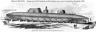USS Keokuk was an experimental ironclad screw steamer of the United States Navy named for the city of Keokuk, Iowa. She was laid down in New York City by designer Charles W. Whitney at J.S. Underhill Shipbuilders, at the head of 11th Street. She was originally named Moodna (sometimes incorrectly spelled "Woodna"), but was renamed while under construction, launched in December 1862 sponsored by Mrs. C. W. Whitney, wife of the builder, and commissioned in early March 1863 with Commander Alexander C. Rhind in command.