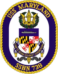 Maryland's coat of arms is emblazoned upon a white oval enclosed by a blue collar edged on the outside with gold rope and is inscribed in gold letters with the words "USS Maryland" above, and "SSBN-738" below.