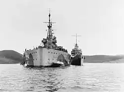 USS McDougal alongside HMS Prince of Wales, to transfer President Franklin D. Roosevelt to the British battleship for the Atlantic Charter meeting with Prime Minister Winston Churchill.