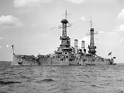 New Hampshire was laid down on 1 May 1905 at the New York Shipbuilding Corporation in Camden, New Jersey. She was launched on 30 June 1906. The ship was commissioned into the US Navy on 19 March 1908; her first commander was Captain Cameron Winslow. After completing final fitting-out work, New Hampshire transported a Marine Expeditionary Regiment to Colón, Panama on 20 June, arriving six days later. She then made a series of visits to ports on the eastern coast of North America, including Portsmouth, New York, and Bridgeport, along with a stop in the Canadian province of Quebec. The ship was then overhauled in New York, followed by training exercises in the Caribbean Sea. On 22 February 1909, she participated in a Naval Review for President Theodore Roosevelt to greet the return of the Great White Fleet in Hampton Roads, Virginia.[3] During this period, Ernest King, later the Chief of Naval Operations during World War II, served aboard the ship in the engine room.[4]