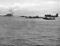 Tuscaloosa's gunners splashed two of the intruders. One, headed for the fantail of Texas, flew apart as the cruiser's shells splashed her in the old battleship's wake. The other headed for an escorting destroyer in the screen only to be splashed after hitting a curtain of fire from the cruiser's guns.