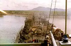 White River spent four days on the front-line in late January 1969, off the I and II Corps areas, supporting the 1st Battalion, 2nd ARVN Division. Responding to a call for gunfire support after the ARVN troops had suffered 15 killed in an assault on an enemy stronghold on 27 January, White River fired upon a North Vietnamese position on the north side of a small hill, 11 miles (18 km) south of the Batangan Peninsula, Quang Ngai Province. A two-hour bombardment killed two VC, wounded one, leveled or damaged 24 structures and started five secondary fires. The next day (28 January), the inshore fire support ship bombarded an enemy staging area 0.5 miles (0.80 km) from the previous day's target, killing 15 VC and destroying 54 structures, 11 of which were of heavy masonry construction and six of which had been used to store petroleum, oil, and lubricant. Additionally, White River's fire damaged 21 other structures and destroyed nine bunkers and 35 meters of trail, triggering five secondary explosions and starting 45 secondary fires. "Still not content to rest on her laurels," a Pacific Fleet chronicler wrote later, "White River directed her 5-inch spin-stabilized rockets at enemy positions in the same area on the 29th and silenced an antiaircraft site," killing or wounding 11 VC.[12]
