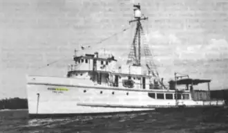 By the beginning of 1951, FWS scientists had determined that the equatorial divergence of currents played a key role in fertilizing the waters of the central Pacific, so Hugh M. Smith got underway for her eighth cruise on 14 January 1951 bound for the waters between Hawaii and the Samoan Islands with a primary goal of making hydrographic observations to investigate equatorial currents farther south than previously to examine their effect on the equatorial divergence.[31][32] During her cruise, she focused on the area between 1 degree North and 7 degrees North — an area found during previous cruises to have a particular abundance of nutrients, plankton, and fish — measuring salinity, dissolved oxygen, chemical nutrients, and the abundance of plankton at thirteen different depths ranging from the surface to 3,700 feet (1,128 m) at 104 stations.[32] The data she gathered assisted FWS scientists in assessing whether the zone moved north and south seasonally, affecting the seasonal abundance of tuna in particular areas.[32] She also recorded 54 sightings of schools of tuna, conducted 460 hours of surface trolling — during which she caught only 25 tuna — collected fish specimens for research purposes, and cooperated with the U.S. Weather Bureau in making meteorological observations four times daily.[32] She returned to Pearl Harbor on 14 March 1951 after a 9,000-nautical-mile (16,700 km; 10,400 mi), 60-day cruise.[32]