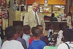 Following this, some Delaware residents met at the Krebs School in Newport to protest integration. Biden spoke to the auditorium and said his position on school busing was evolving, emphasizing that busing in Delaware was in his opinion beyond court restrictions. The crowd was unconvinced, and heckled him until he yielded the microphone.[49] This, along with the prospect of a busing plan in Wilmington, led Biden to align himself with civil rights opponent Senator Jesse Helms (R-NC) in opposing busing. Biden and anti-busing senators wanted to limit the scope of Title VI of the Civil Rights Act of 1964 with respect to the federal government's power to enforce school integration policies.[46] After 1975, Biden took a harsher line on further legislative action to limit busing.[2] That year, Helms proposed an anti-integration amendment to an education bill that would stop the Department of Health, Education, and Welfare (HEW) from collecting data about students' or teachers' races and thereby prevent it from defunding districts that refused to integrate. Biden supported this amendment, saying: "I am sure it comes as a surprise to some of my colleagues ... that a senator with a voting record such as mine stands up and supports" it.[50] He said busing was a "bankrupt idea [that violated] the cardinal rule of common sense", and that his opposition would make it easier for other liberals to follow suit.[2] But he had also supported integrationist Senator Edward Brooke's (R-MA) initiatives on housing, job opportunities and voting rights.[48] Civil rights lawyer and NAACP Legal Defense Fund director Jack Greenberg criticized Biden's support for the bill, saying it "heave[d] a brick through the window of school integration", with Biden's hand on the brick.[51]