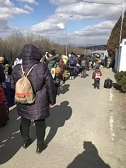 Other refugees traveled by motor vehicles or on foot. In some border crossings, traffic jams of several kilometres long formed.[45] Air travel was not available in Ukraine as the country closed its airspace to civilian flights on the day of the invasion.[46]