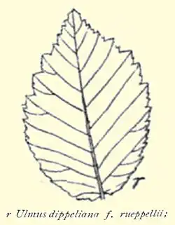 Ulmus minor 'Rueppellii' is a Field Elm cultivar said to have been introduced to Europe from Tashkent by the Späth nursery, Berlin.[2][3] Noted in 1881 as a 'new elm',[4] it was listed in Späth Catalogue 73, p. 124, 1888–89, and in subsequent catalogues, as Ulmus campestris Rueppelli, and later by Krüssmann[5] as a cultivar.[6]