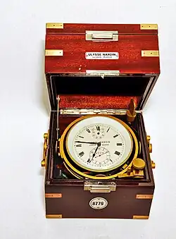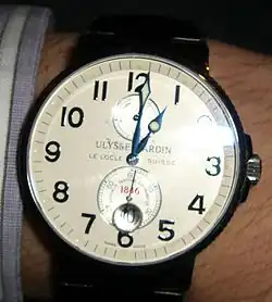 In 1902, the company started to deliver marine chronometers to the United States Navy.[23] The brand regularly won Washington Naval Observatory competitions and became the official supplier for the US Navy's torpedo boats.[24][25] The company has since provided timepieces to the navies of the United States, United Kingdom, Russia and Japan.[26] Since the 1870s, over 50 navies and international shipping companies had been equipped with Ulysse Nardin marine chronometers.[8]