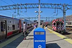 Cross-platform transfer between Metro-North (left) and Shore Line East trains at New Haven