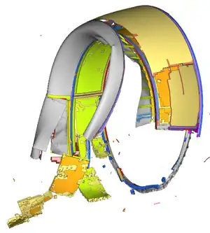 Interior surfaces of the fan case and the remains of the inlet duct showed scratches and gouges that were in a spiral pattern across the fan case and front flange onto the inlet duct to the broken edge of the duct on the inboard area of the nacelle. The examination of the fan case showed that there were three distinct patterns of tracks along the flow path that appeared to spiral forward from the plane of the fan blades' leading edge across the A-flange on to the inlet duct's inner barrel.[11]