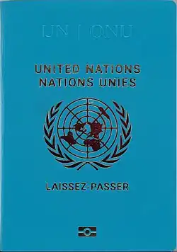 ![]() The front cover of a blue biometric United Nations laissez-passer. | |