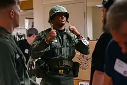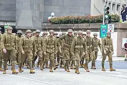 Most of the tanks, vehicles and equipment for the parade were shipped from Fort Hood in Texas, to Jessup, Maryland, by train, and were then transported on flatbed trucks to D.C.[28] Soldiers for the parade slept in cots in government buildings including the Department of Agriculture headquarters, a government warehouse owned by the General Service Administration on Seventh Street, and at Joint Base Andrews.[10][32] The Army had difficulty finding uniforms for the War of 1812 and the Spanish-American War and eventually eliminated them from the program,[10] due to "running into trouble with the costuming process".[33] Many of the costumes were sourced from Hollywood prop houses.[34]