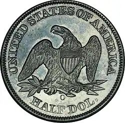 In 1860 the U.S. Mint eliminated the stars on the obverse of Seated Liberty half dimes and dimes, replacing them with the legend "United States of America", which had previously appeared around the wreath on the reverse of the coins. Before this time, half dimes and dimes minted in New Orleans and San Francisco had featured their mintmarks inside the wreaths. Afterwards, the "O" and "S" (and, later, the "CC" for Carson City) mintmarks were located below the wreath next to the rim. On quarters, half dollars, and silver dollars, the mintmarks were always placed below the eagle but above the coin currency on the reverse.[10]