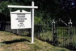 The unknown lies buried about 100 ft (30 m) away from Colley.[12] Since 1956, a Confederate flag has been placed beside his headstone on Memorial Day. Two Southern women sent the first flag and persuaded the town to place it at his grave.[13] The Daughters of the Confederacy continued the tradition in later years.[13]