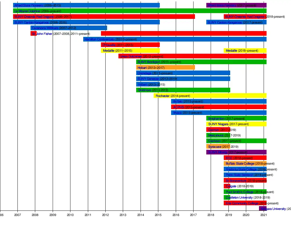 Niagara UniversityErie Community CollegeCastleton UniversityPaul Smith's CollegeColgate UniversitySt Bonaventure UniversityPenn State BehrendSUNY FredoniaBuffalo State CollegeErie Community CollegeSUNY AlbanySyracuse UniversityClarkson UniversityMercyhurst UniversityGannon UniversitySUNY NiagaraBinghamton UniversityIthaca CollegeAlbany College of Pharmacy and Health SciencesUniversity at BuffaloUniversity of RochesterSkidmore CollegeHilbert CollegeSUNY GeneseoOnondaga Community CollegeHobart and William Smith CollegesSUNY BrockportUnion DutchmenMedaille CollegeMedaille CollegeD'Youville UniversityHamilton ContinentalsSt. John Fisher UniversityCazenovia WildcatsSUNY Canton KangaroosSUNY Canton KangaroosSUNY Oneonta Red DragonsSUNY Oneonta Red DragonsLe Moyne DolphinsAlfred State PioneersAlfred State Pioneers