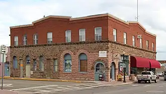 First floor constructed after 1901 fire; 2nd floor 1927 "Rusticated" Romanesque Revival Originally bank, has been newspaper, telephone/telegraph office. Constructed of locally quarried dacite; 2nd story brick[1][2]