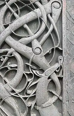 The Urnes style doorway with carved whorls of writhing snakes and vines, in a welter of elongated animals and plants reduced to vines. The most important point of the huge tangle is to present the intertwinedness itself of all living things, animal or vegetable. On the right hand side, about one-third of the way from the bottom a serpent is even emitting a fleur-de-lis from its mouth. The visual characteristic is often referred to by art historians as the Urnes style.[3][5]