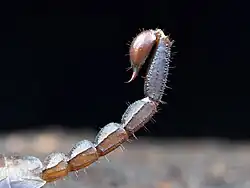 Western forest scorpions have eight legs and two large claws in front of their mouths.[5] Their bodies are more "squat" with skinnier tails than other scorpion species.[6] Western forest scorpions are typically dark brown or black. Their legs are a translucent yellowish-brown. Males have a duller color than females. Males are also smaller and shorter in length.[7] Fifth metasomal segment has a ventral median carina which forks to form a "Y".[8]