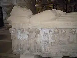 Queen Urraca was buried, dressed as a nun with her hands folded across her chest, in a stone sepulchre which was previously at the Monastery of Santa María la Real in Vileña, Burgos, that she had founded and is now in ruins. Her sarcophagus, currently at the Museo del Retablo in Burgos, bears the following inscription at her feet: DOÑA hURRACA hYJA DeL CONDE DON LOPE DÍAZ / MVGER DEL REY DON FERNANDO DE LEON (Doña Urraca, daughter of Count Lope Díaz, wife of King Fernando of León).