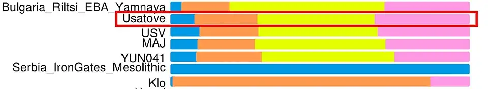 Recent studies indicate that Usatove ancestry consists of equal parts of the ancestry of the Lower Volga-Caucasus (CLV, PVgroup) and Trypillia.[11]