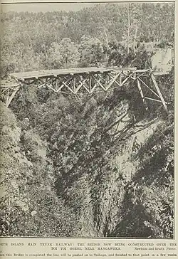 Toi Toi Viaduct lies about 3 km (1.9 mi) south of Utiku.[18] It is 59 m (194 ft) long and up to 58 m (190 ft)[19] above the Toi Toi Creek.[20] The contract for the steelwork went to Scott Bros of Christchurch.[21] Work on the viaduct was under the cooperative system. It was completed in February 1904[22] and tested in September 1904.[23] It is one of the few dating from that era, though it was strengthened in 1934.[23] The Mangaweka deviation of 1981 starts just south of the viaduct.[24]