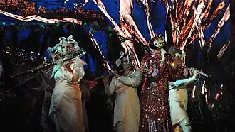 On 15 March 2018, Björk announced a special dress/stage rehearsal of the Utopia tour at the Háskólabío Theater in her hometown of Reykjavik as well as the touring members of her band. Percussionist and Hang player Manu Delago once again traveled with the Icelandic singer, a tradition that began with the 2011 Biophilia tour. He was replaced by Samuli Kosminen in Sweden and Finland.[15] Bergur Þórisson performed on electronics. Katie Buckley played harp in all locations except Barcelona. Tara Lee Minton played harp in Barcelona. A seven-woman flute ensemble, composed of members Melkorka Ólafsdóttir, Áshildur Haraldsdóttir, Berglind María Tómasdóttir, Steinunn Vala Pálsdóttir, Björg Brjánsdóttir, Þuríður Jónsdóttir and Emilía Rós Sigfúsdóttir, rounded out the touring band; this is 5 fewer flutists than what appeared on the studio album, a decision Björk said would allow the listener to focus on the individual sounds each flutist is playing. "These girls are all very different,” she told The Reykjavik Grapevine. “Some of them are into modern music, some are more into French romanticism, others are doing more improv and experimental music, and they’re the best flautists in Iceland!" [16] Arca, who co-produced the studio album and created the beats, electronics and synths, did not tour with her. The dress rehearsal was set for 12 April 2018, over a month ahead of the previously announced first date at All Points East in London. The tour was designed by Heimi Sverrisson and choreographed by Margrét Bjarnadóttir. A second rehearsal date was later added at the same Icelandic venue on 9 April due to the original date selling out, which moved up the premiere of the Utopia tour by three days.[17] While doing press for the opening night of the tour, the flute band's name was revealed: Viibra.[18]
