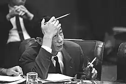 After the Geneva Conference in 1954, Vũ Văn Thái joined the government of the State of Vietnam.[5][11]He successively served as the director of the Tonggan Dam Reconstruction Planning Bureau,[7] and director of the Budget and Foreign Aid Bureau.[note 1][13] In 1961, a conflict broke out between Vũ Văn Thái and Ngô Đình Diệm, and he resigned from the government.[5] He then moved to the United Nations Secretariat, where he served first as a consultant in the Finance and Financial Sector and then as a consultant to the Government of Togo.[13]
