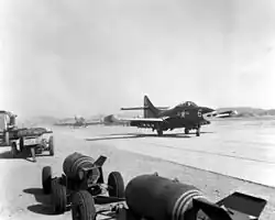 In 1949, VMF-115 was the first Marine Corps squadron equipped with Grumman F9F-2 Panther jets, and on 20 November 1950, the first Marine squadron to carrier qualify all 18 pilots aboard the USS Franklin D. Roosevelt.[3] The squadron then deployed to Pohang, Korea, for combat operation in February 1952. In late-June 1952 they participated in the attack on the Sui-ho Dam. Throughout the Korean War, VMF-115 expended more ordnance than any other Marine jet fighter squadron. A total of 15,350 flight hours were logged on 9,250 combat sorties with a price of 19 aircraft lost. Six pilots were lost with their aircraft in a single day and a total of 14 pilots were killed in action. Close air support was provided by VMF-115 in battles such as Bunker Hill, The Hook, Reno, Carson-Elko, Vegas, Berlin, East Berlin, and the Marines famous battle at the Chosin Reservoir.