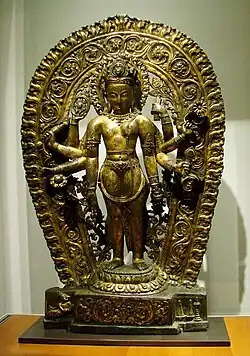 The concept as well as iconography of Vaikuntha-Kamalaja is derived from Ardhanarishvara – the popular androgynous form of the god Shiva and his consort Parvati.[1][2][3] P. Pal suggests that the concept of Vaikuntha-Kamalaja originated in Eastern India and then migrated to Nepal, however according to Deo, the concept originated in medieval Nepal, which D. C. Sircar refutes citing an 11th-century Gaya inscription.[3] A late 11th century inscription of the local ruler Yakshapala in the Shitala Gaya Temple in Gaya, India says that Yakshapala built the temple to house a number of deities, including Kamalardhangina-Narayana, "Narayana (Vishnu) whose half body is Kamala ("Lakshmi").[3] According to another theory, Kashmir was the birthplace of Vaikuntha-Kamalaja.[6] Although relevant Indian texts and icons of Vaikuntha-Kamalaja are found in Nepal, hardly any exist in India except Kashmir.[1][4] Some notable Indian icons of Vaikuntha-Kamalaja are found at Bijbehara (late 10th–11th century), Anantnag, Kashmir; Jaintipur, Haryana; Baijnath Temple, Himachal Pradesh (1204 CE) and the Sayana Thakura icon of Jagannath Temple, Puri.[5][6][9]