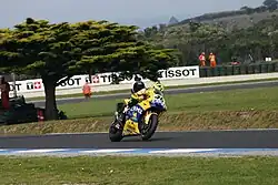 Rossi scored three pole positions in the next three races and finished second in France after battling with Gibernau, who overtook him on the last lap.[72][73] He won in Italy and came second again in Catalunya.[74][75] He took two third-place finishes in the Dutch and British rounds – the latter the result of a ten-second penalty for overtaking under yellow flags, which gifted victory to Max Biaggi in the process – and another second place in Germany, once again battling Gibernau who denied him victory with just 0.060 seconds separating both when they crossed the finish line after a titanic battle between the two.[76][77][78]