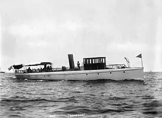 Vamoose was a fast steam-powered private yacht built for William Randolph Hearst by the Herreshoff Manufacturing Company. Designed by Nathanael Greene Herreshoff, she was based on an earlier torpedo boat commissioned by the United States Navy.[1] At one point, Vamoose was claimed to be the fastest boat in the world, and her exploits drew attention from newspapers and yachting enthusiasts of the day. The majority of her life was spent in New York metropolitan area; as a member of the American Yacht Club, she participated in regattas as both a competitor and a press boat.[4] In 1896, Vamoose was outfitted as a private dispatch boat for the New York Evening Journal to cover the Cuban War of Independence.