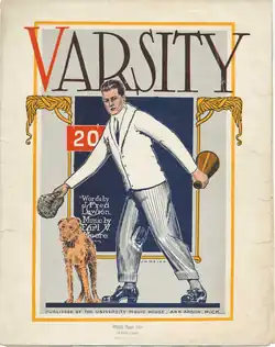 "Varsity" was first played at a Friday night pep rally held at University Hall on October 6, 1911, where Michigan Marching Band director Eugene Fischer heard it and agreed to play it the very next day during the football team's game against Case.[1][4] It is likely that Fischer made his own band arrangement of the song overnight. After the performance of "Varsity" at halftime of the Case game, The Michigan Daily called it "stirring" and opined that it would become "one of Michigan's most popular songs".[5] It was featured in the song book Michigan’s Favorite College Songs in 1913, the third and final major song book to be produced by the university.[6]