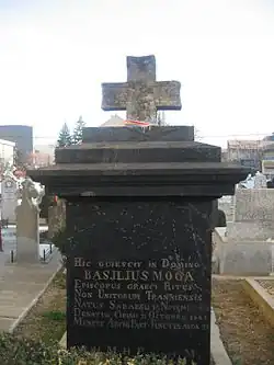 One of Moga's later actions involved the Orthodox of his native town Sebeș. As far back as 1817, he had asked his brother Zaharia to secure funds from the local treasury for a new church, on the basis that most taxpayers were Romanian. Moga sent petitions to the government and even the Emperor about this matter, but they remained unanswered. Finally, he sued the town hall in 1840, spending considerable sums on the case, but died during the course of the trial. Initially, his nephew Ioan continued to fight in court, but, old and sick, soon lost interest.[11] Upon his death in 1845, Moga was buried in the yard of the Annunciation Church.[11] In his will, the bishop bequeathed to the church assessors his residence and a second house in Sibiu, as well as an orchard; he also left behind an endowment for paying the church's lawyers and other needs.[12] While his eventual successor Andrei Șaguna has been the subject of ample historiographic study, Moga's life has generally been treated in cursory fashion, with the last biography appearing in 1938.[13] One noted study, published in 1915 by Ioan Lupaș, analyzed the dispute between Moga and Lazăr.[14]
