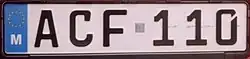 Maltese registration plates are the number plates used within Malta to uniquely identify motor vehicles. Since 1995, the three letter, three number system (ZZZ 999) has been in use in Malta for vehicle registration. The characters are always printed in black on a white background, and to the left one can find a blue box with the Flag of the European Union and the letter M (for Malta) underneath it in white. The typeface used on Maltese registration plates is FE-Schrift which is also the typeface used on German vehicle registration plates.