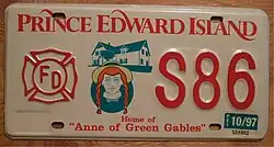 Volunteer firefighter | 1993–1997 | Embossed red serial on reflective white plate; green and red Anne of Green Gables graphic slightly to left of centre; "PRINCE EDWARD ISLAND" screened in red at top | "Home of "Anne of Green Gables"" screened in red centred at bottom | A12 | ||