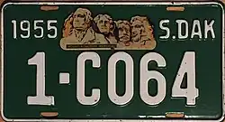 1955 | Embossed white on green with border line; "1955", Mount Rushmore decal and "S.DAK" at top | none | 1-1234 1-A123 10-1234 10-A123 |
