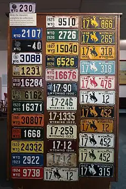 - ^ "New Wyoming Auto License Plates Appear". Weston County Gazette. Upton. October 15, 1936. Retrieved January 28, 2016.