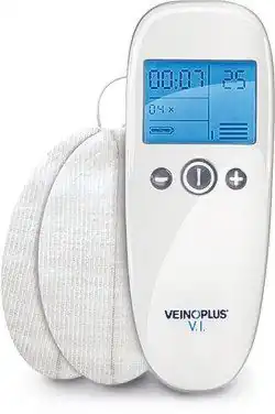 Veinoplus is composed of a pocket-size device linked to two electrodes. The device has three buttons: a central one to turn on and off the device and two buttons marked “+” and “-” to adjust the intensity of stimulation. The electrodes have to be placed on the calf: either both electrodes on one calf if the venous disease affects only one leg, or one electrode on each calf if the pathology concerns both legs.