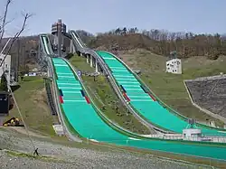 During the ski jumping individual normal hill event at the Hakuba Ski Jumping Stadium, the final two jumpers on the second jump were delayed from their jumps to high winds.[32] Finland's Jani Soininen jumped 89 meters to advance one point ahead of Japan's Kazuyoshi Funaki.[32] Funaki's teammate Masahiko Harada, who led after the first jump, needed a jump of 88 meters to win gold, but only jumped 84.5 meters and ended up in fifth place.[32] Soininen would later complain bitterly about the officials' decision despite his gold medal win.[32] In the individual large hill event, Funaki jumped so far that he landed beyond the video measuring area which resulted in the distance being measured manually.[33] Funaki's jump was recorded as 132.5 meters and it also garnered perfect style points.[33] The Japanese ski jumper would win gold in the event.[33]