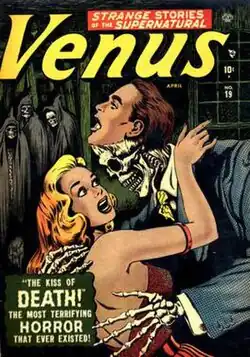 From issue 10 the title took on a science fiction slant, and included stories by Russ Heath and Joe Maneely.[1] By issue 11 the comic added the slogan "Strange Stories of the Supernatural" and though the tales still included Venus and other supporting characters, the comic began to morph into a horror/sci-fi anthology. In issue 12 Loki is joined by Thor to rescue Venus from the clutches of the evil sultan Khorak.[3] By issue 17 the romance angle was dropped and Venus became a horror anthology, with the cover drawn by Bill Everett, and is classed as a bondage comic cover as it shows Venus chained to a dungeon wall.[1] Everett supplied the covers for the final two issues as well as interior art, and issue nineteen is a classic pre-Comic Code horror book cover with Venus being embraced by a living skeleton.[1]