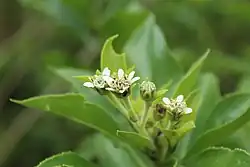 Shrub that reaches 8 ft (2.5 m) in height. The leaves are alternate, coriaceous, ovate to ovate-lanceolate, glabrous on the upper surface and lower side; the apex is acute, the base is attenuated, forming a pseudopeciolus; Revolute margin, dentated only in upper two-thirds; pinnate venation. Inflorescences in corymbs or panicles, the pedicels are villous. Uniseriate bell-shaped involucre; the involucral bracts are linear-oblong, widened at the base and acute at the apex, glabrous or with sericeous indumentum towards the base. Convex receptacle; the paleas are oblong, folded, acute, glabrous, dark and with translucent spots, slightly ciliated on the margin. The flowers are white, with 5-10 female ray florets, ligulate, with a pubescent tube, the ligule is elliptical and tridentate, the style is bifid and glabrous, the ovary is triquetral, uniaristate and without a fin; with about 20 disk florets, hermaphroditic, with hairy tubulous corolla, slightly pentadentate, the teeth are oblong; anthers blackish with a mutic base. Obovate compressed achenes 4 mm in length, the external ones are thicker, hairy and with a poorly developed fin; the internal ones with scant indumentum, and a clear and ciliated fin; pappus formed by two ciliated edges.[2]